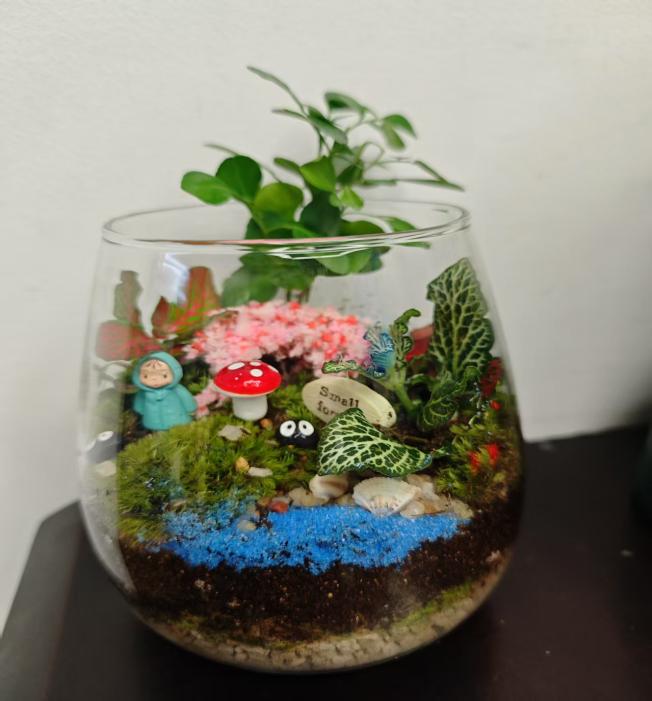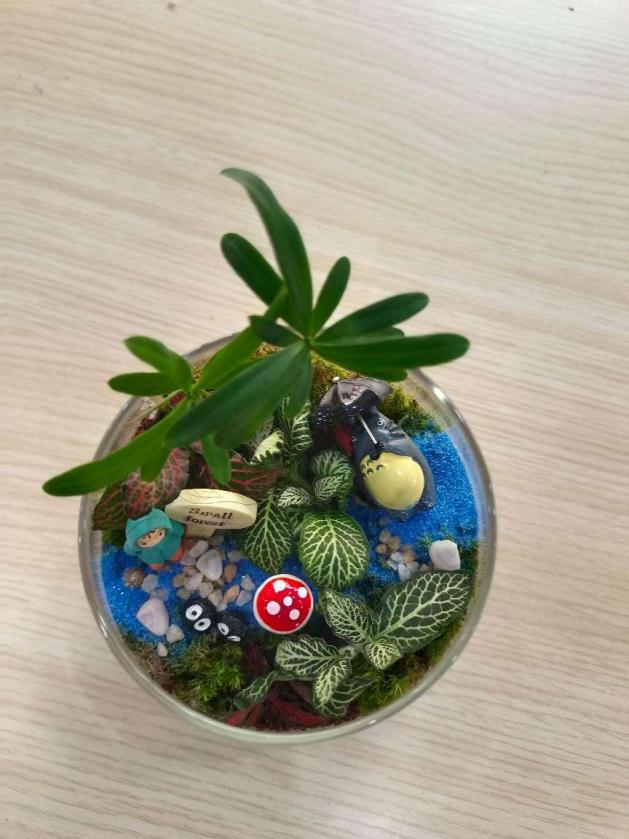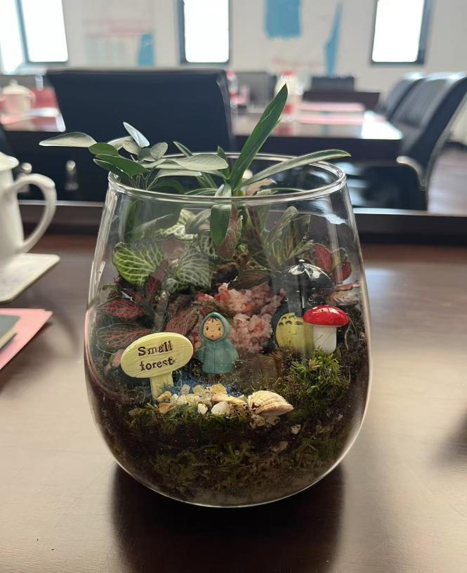 活动现场,苔藓、多肉植物、砂石、迷你摆件、玻璃瓶等材料整齐摆放,静待教职工们施展巧思。专业老师以生动的讲解揭开活动序幕,从微景观的构图美学到植物养护的实用技巧,辅以娴熟的示范操作。随后,各位教职工化身“自然设计师”,将绿意盎然的苔藓、形态各异的多肉绿植与精巧的装饰品巧妙搭配,精心缔造出属于自己的微观世界。一方方玻璃容器中,绿意蔓延、春色跃动,既有自然的清新,又融入了独特的艺术气息。活动中,大家或专注构思,或交流心得,欢声笑语间,一件件充满个性的微景观作品陆续诞生。