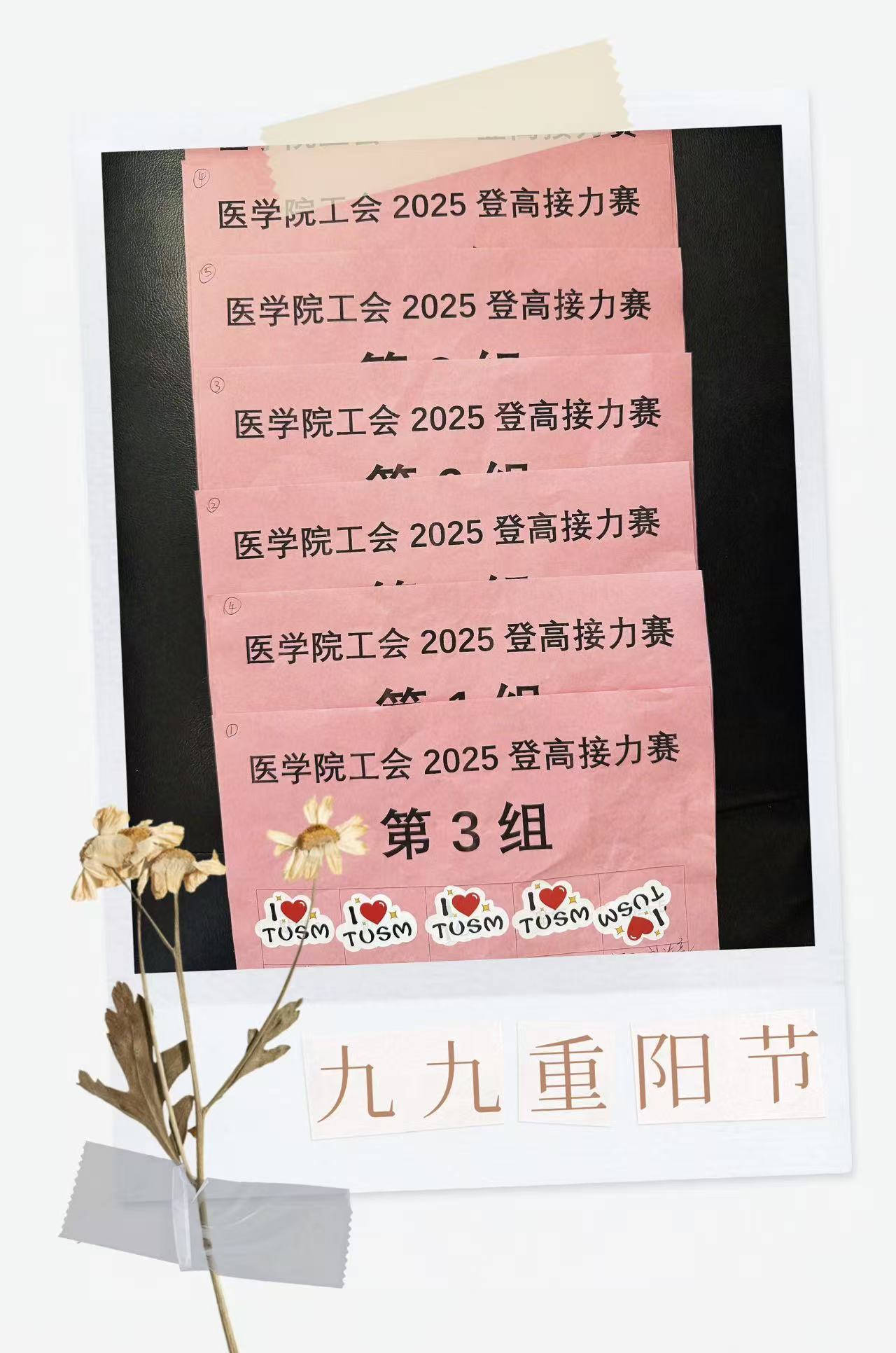 为传承重阳节登高祈福的传统,丰富医学院教职工的文化生活,倡导健康向上的生活方式,10月28日下午,同济大学医学院在沪西校区第二教学楼成功举办2025年迎重阳校内登高比赛。来自医学院各院系的教职工们组成多支队伍踊跃参赛,在欢声笑语中共度重阳佳节。 此次登高比赛以“健康登高,欢乐重阳”为主题,医学院工会提前制定详细方案,从比赛规则设计到现场保障均做足准备。考虑到重阳节的节日属性与参赛教职工的年龄特点,比赛在组队要求上特别规定“每5人自主组队,队伍总计年龄和≥175岁”,既鼓励不同年龄段教职工相互协作,也让更多教职工能参与其中。 比赛现场,队员持手牌从135教室出发,沿西侧楼梯稳步向五楼顶层迈进。到达顶层后,队员在活动标识前举牌拍照,将照片上传至活动群完成打卡,随后沿中部大楼梯返回1楼大厅,回到135教室签到并粘贴专属活动贴纸,紧接着将手牌交给下一位接力队员,整个流程紧凑有序。教学楼西侧楼梯与中部大楼梯等关键节点安排志愿者引导,全方位保障参赛人员的安全。