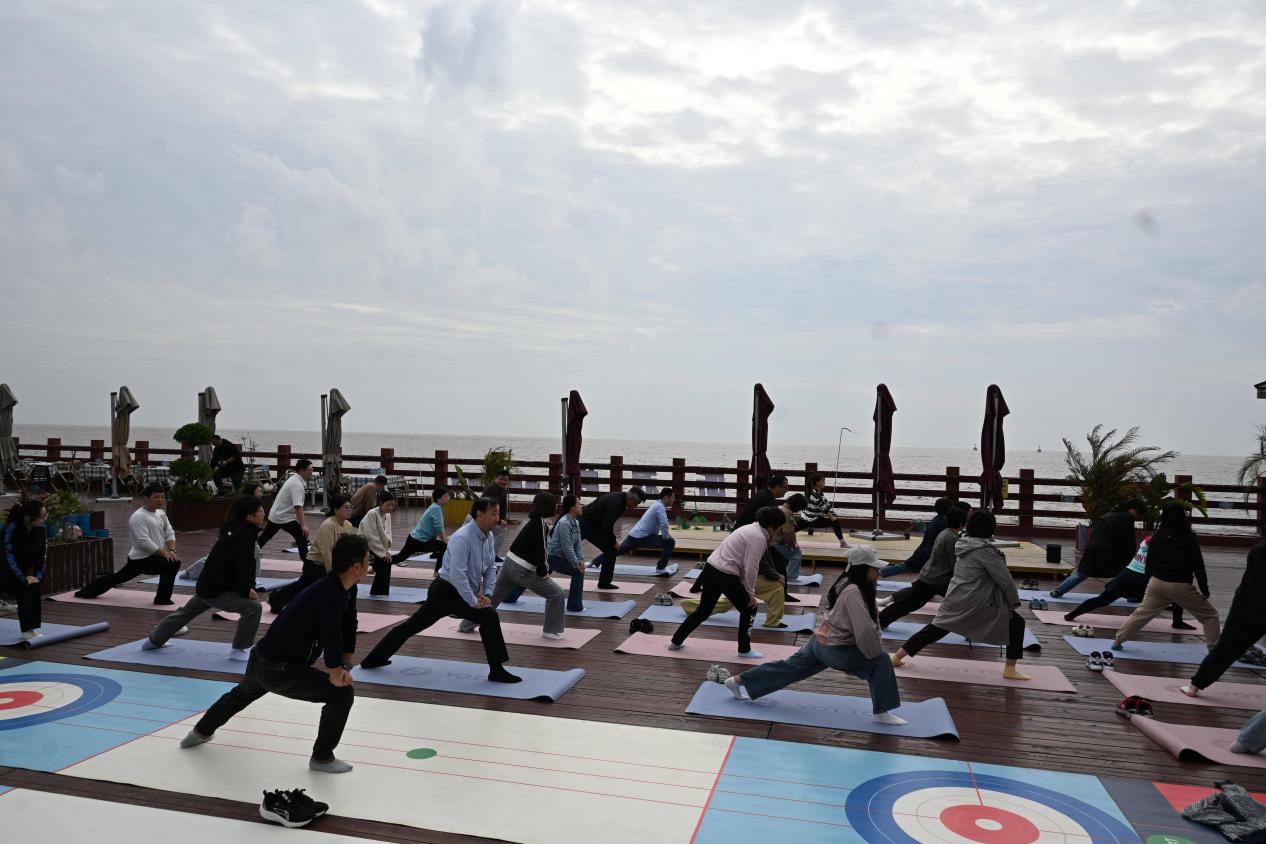 在简短休整后,团队建设与素质拓展环节正式开始。在专业教练的带领下,全体员工面朝东海,进行了舒缓身心的瑜伽练习。海风拂面,身心舒展,有效缓解了日常工作的紧张与疲惫。