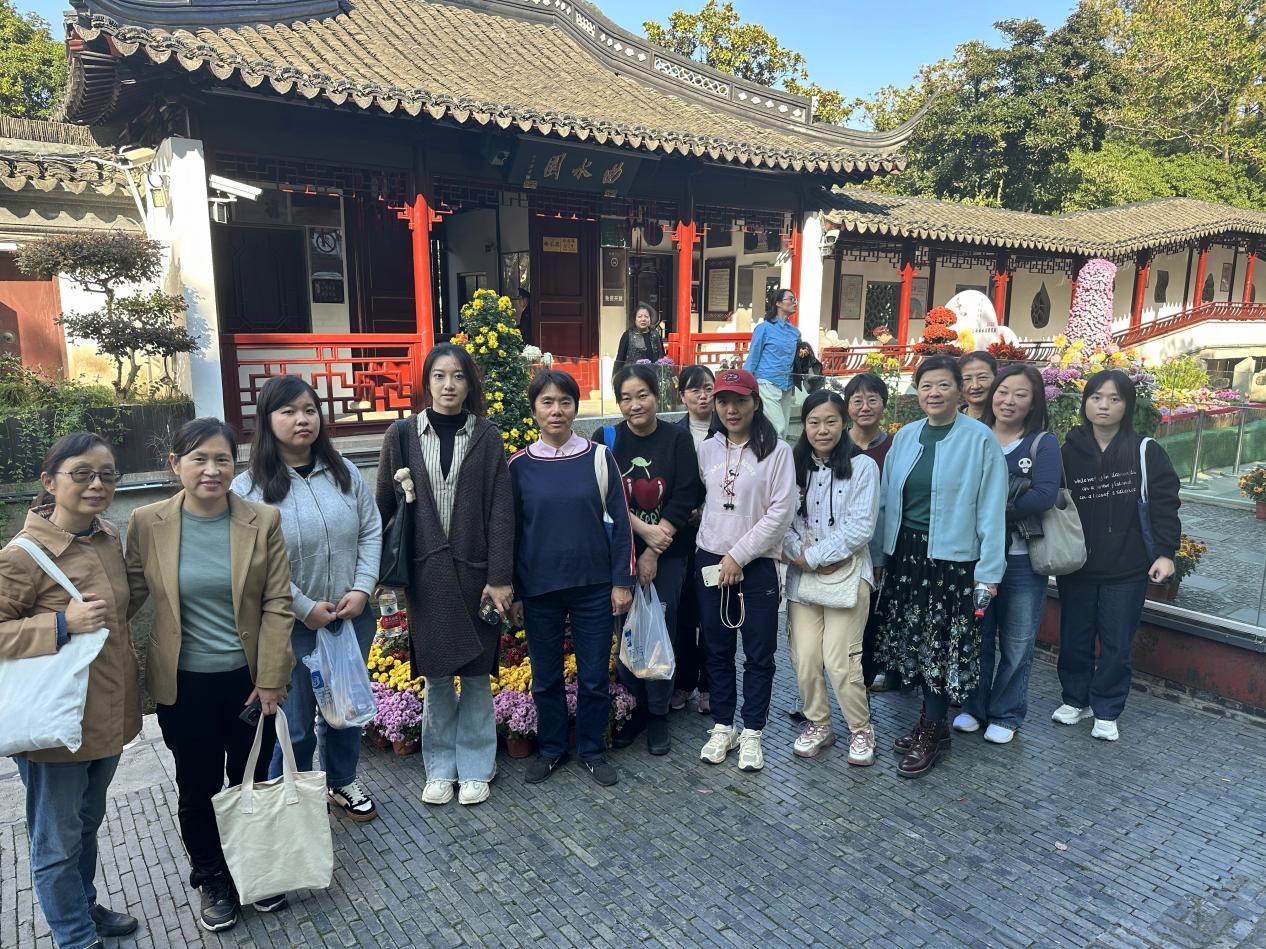 时值金秋,菊香满园。本次活动恰逢2025上海曲水园菊花展举办期间,为女教职工们带来了一场融合园林艺术与秋日雅趣的文化体验。大家漫步于这座有着二百余年历史的江南名园,不仅领略了亭台楼阁的错落有致,品味了匾额楹联的文学意蕴,更欣赏到数百个品种的秋菊盛景。园内“菊韵江南”“秋意浓”等主题展区,将古典造园艺术与菊花文化完美融合,为女教职工们呈现出一幅“秋菊有佳色,裛露掇其英”的诗意画卷。
