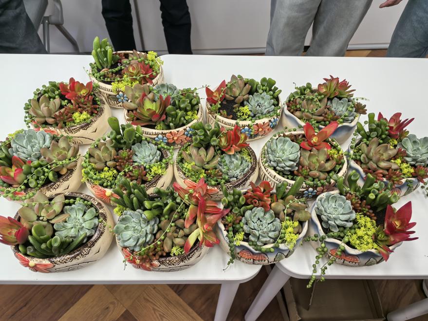 活动接近尾声,“成果展示”环节将氛围推向高潮。大家纷纷将自己的多肉盆景摆放在一起,仿佛一片小小的“多肉花园”,每一盆都凝聚着制作者的心意与智慧。大家互相欣赏着彼此的作品,脸上洋溢着满意的笑容,在欢声笑语中满载而归。