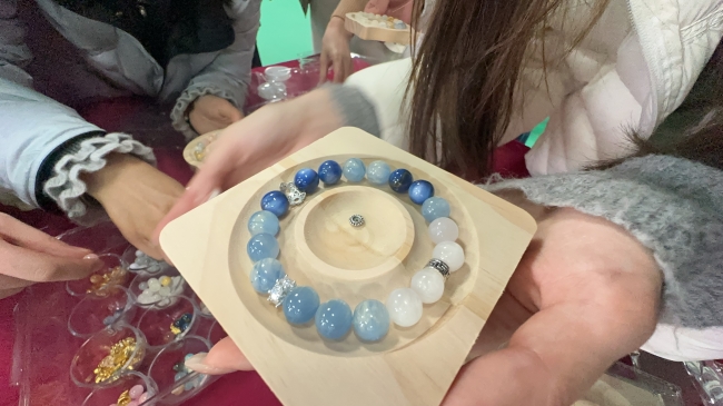 指尖匠心:手作体验定格治愈时光 在感受了美学魅力之后,活动进入了温馨的手工串珠体验环节。多功能房的长桌上准备了丰富精美的专属串珠材料。在老师简单讲解了选珠配色、串珠技巧及打结收尾的方法后,大家纷纷化身“手作达人”,开启了自由创作。女教师们或低头专注穿引,或轻声交流配色灵感,有的将晶莹的珠子串联成优雅的手链,有的则巧妙构思打造出可爱的专属钥匙扣。大家在穿引珠玉的过程中,不仅体验到了手工创作的乐趣,更享受到了“慢下来”的宁静与治愈。