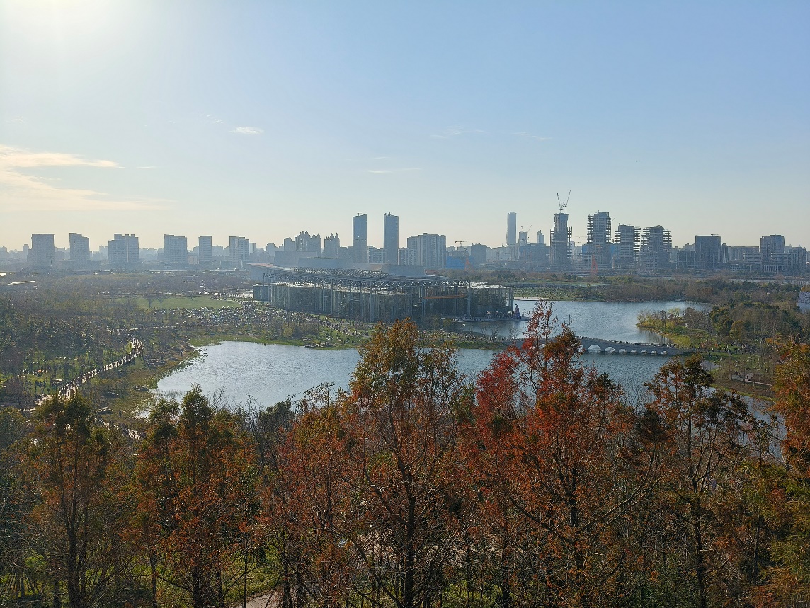 带着满眼的绿意与花香,大家踏上了活动的第二站——双子山。这座国内首座超过40米高度的空腔结构人工仿自然山林,虽为人作,宛若天开。大家拾级而上,漫步在蜿蜒的山间步道,沿途欣赏着新抽芽的树木与错落有致的山石。登顶主峰观景平台,视野豁然开朗,整个世博文化公园的美景尽收眼底,远处的城市天际线与近处的湖光山色交相辉映,构成一幅和谐的城市生态画卷。大家纷纷在此打卡留念,记录下这“一览众山小”的惬意时刻。