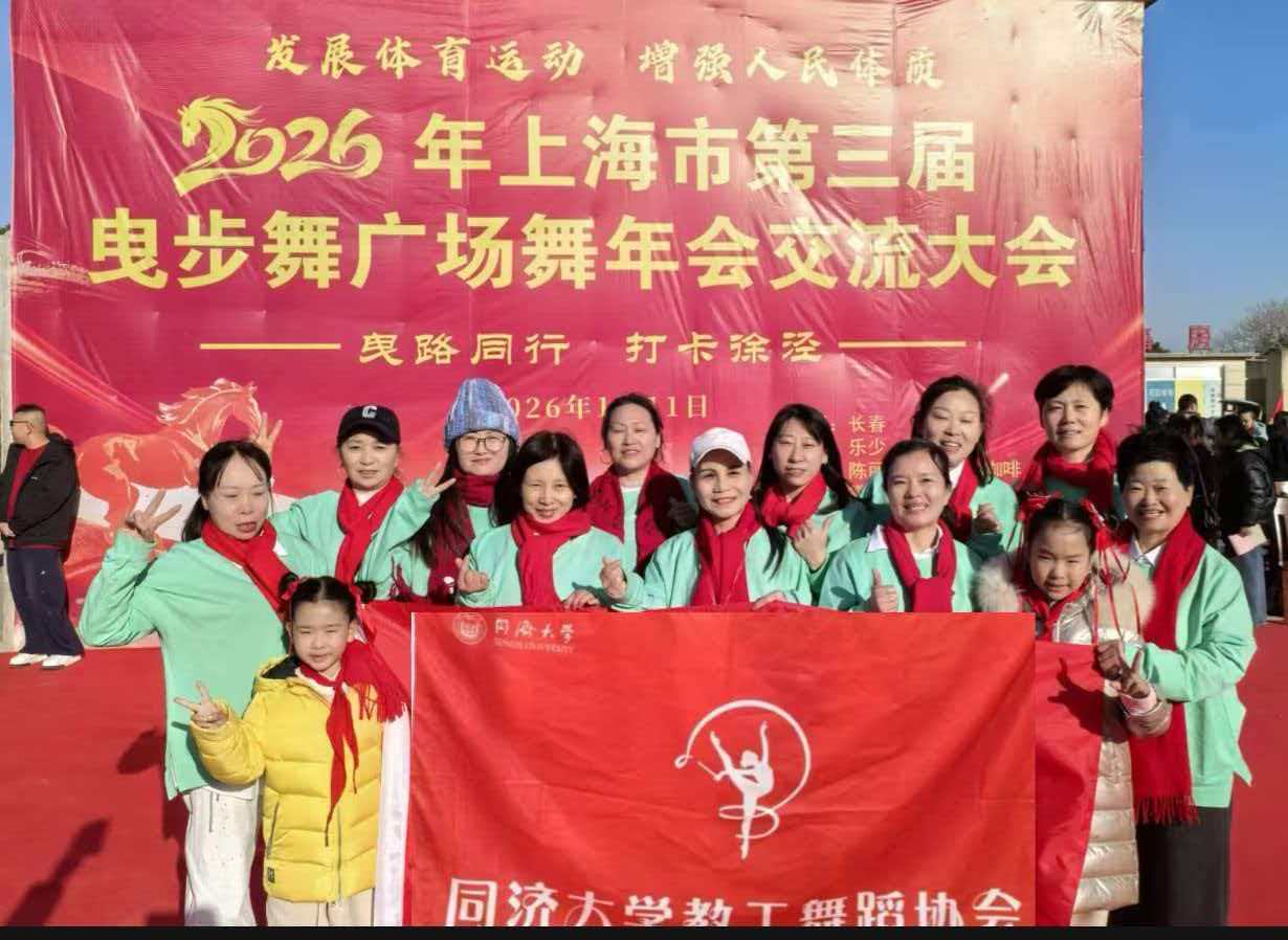 为丰富教职工业余文化生活,展示高校教职工健康向上的精神风貌,1月11日,同济大学教工舞蹈协会组队参加“2026年上海市第三届曳步舞广场舞年会交流大会”。本次大会以“莫路同行·打卡涂泾”为主题,吸引了来自全市各界的舞蹈爱好者600余人齐聚一堂,共享体育舞蹈带来的活力与欢乐。