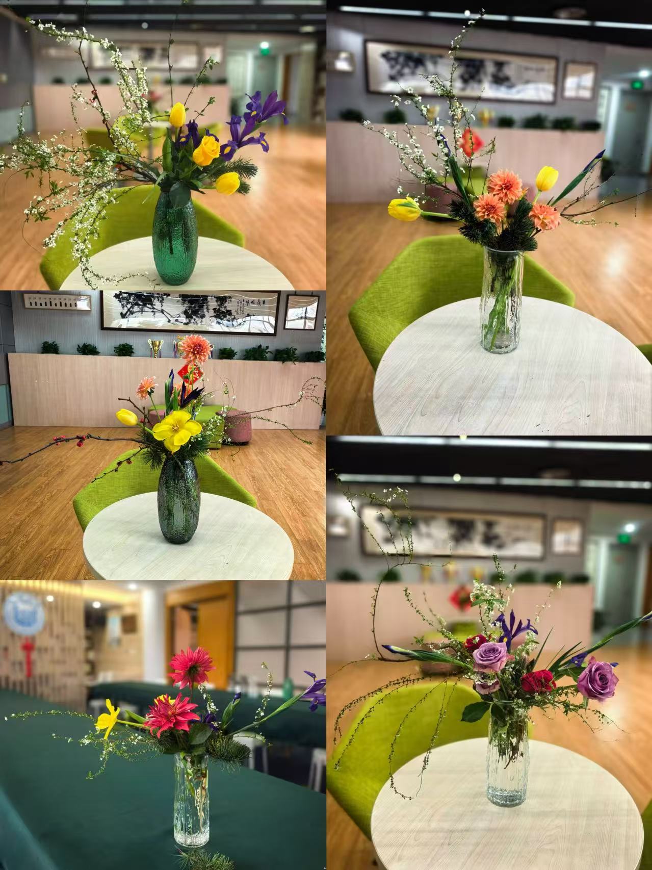 活动现场,魏语萱老师巧妙结合春晚《贺花神》热点,以“十二月令花神”为主题,引领老师们开启了一场穿越千年的花艺美学之旅。女教工们兴致盎然,全情投入创作。她们手持玫瑰、鸢尾、雪柳等新鲜花材,遵循“疏密有致、仰俯呼应”的原则,在修剪与组合中融入自己的审美巧思。有的作品清雅简约,以精炼花材凸显线条之美;有的则注重色彩层次,通过冷暖色调的碰撞营造饱满意境。原本普通的花材,在老师们的巧手匠心之下,逐渐蜕变为一件件独具韵味的艺术佳作,既承袭了海派插花的精致优雅,又饱含着教育工作者独特的人文情怀。现场欢声笑语不断,大家交流技巧、分享创意,在专注创作中舒缓了工作压力,收获了满满的成就感与喜悦。